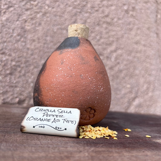 Organically grown seeds stored inside a handmade clay pot with a scroll detailing the seed variety, days to maturity, location last grown, origin of species, and the Known Lineage of Growers before you. We grow the seeds. We make the pots. We write the scrolls.